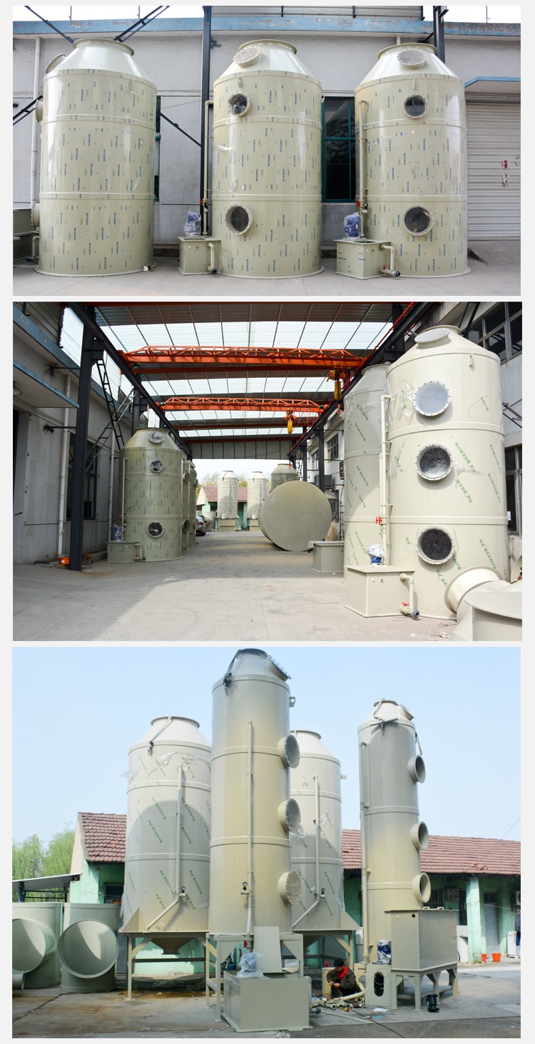 洗滌塔利用氣體與液體間的接觸,而將氣體中的污染物傳送到液體中,然后再將清潔氣體與污染的液體分離,達(dá)到清潔空氣的目的。廢氣經(jīng)由填充式酸霧洗滌塔,采用氣液逆向吸收方式處理,即液體自塔頂向下以霧狀(或小液滴)噴灑而下。廢氣則由塔體(逆向流)達(dá)到氣液接觸之目的。此處理方式可冷卻廢氣、調(diào)理氣體及去除顆粒,在經(jīng)過除霧段處理后,排入大氣中。